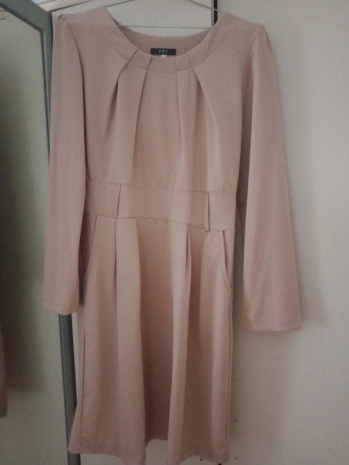 Bej renkte, uzun kollu ve yuvarlak yakalı midi elbise. Yumuşak sentetik kumaştan, bol kesim ve piliseli detaylara sahip, modern klasik ofis tarzı için uygun.