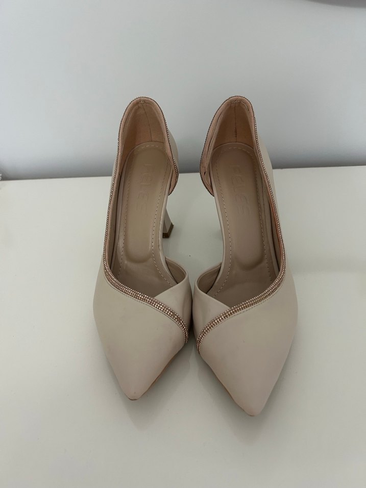 Bej renkte, piliseli detaylı ve yumuşak kauçuk malzemeden stiletto topuklu kadın ayakkabısı. Minimalist ve desensiz tasarımıyla ofis ve akşam kullanımı için uygundur.