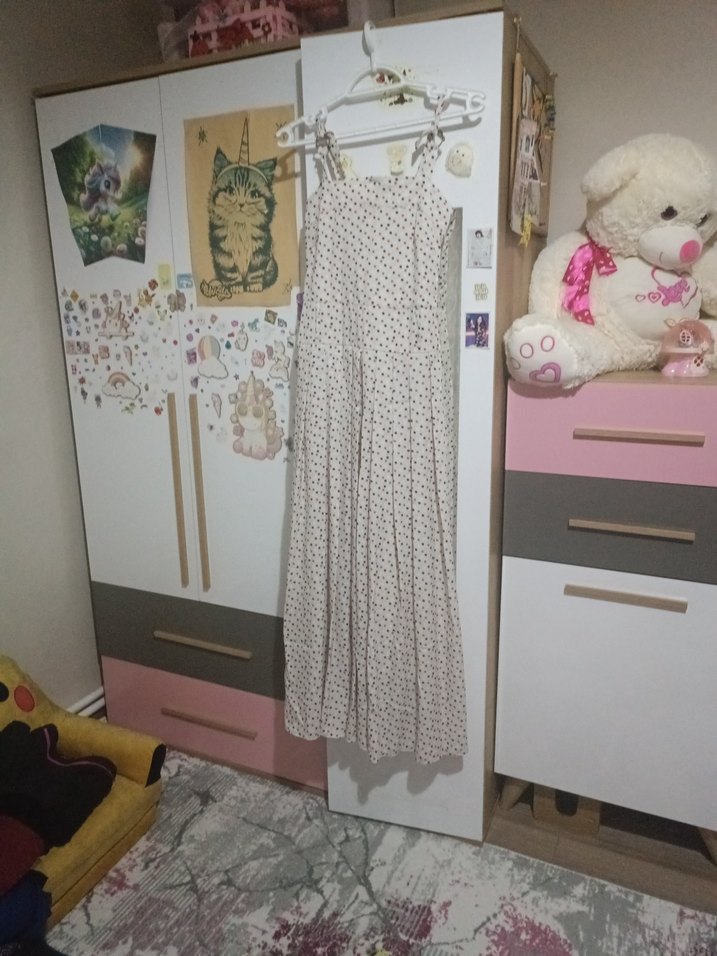 Pamuklu, baskılı, piliseli ve straplez uzun elbise. Gevşek kesimi ve bej rengiyle bohem vintage tarzını yansıtıyor.