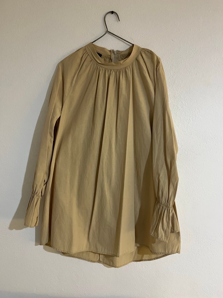 Bej renkte, yüksek yakalı ve piliseli uzun kollu tunik. Bol kesim ve midi boyda, günlük kullanıma uygun. Yumuşak keten kumaştan üretilmiştir.
