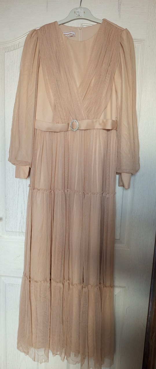 Bej renkli, piliseli uzun elbise, ipeksi dokuda ve V yakalıdır. Salaş kesim, askılı kol ve kemer detayı ile vintage bohem tarzda, düğünler için uygundur.