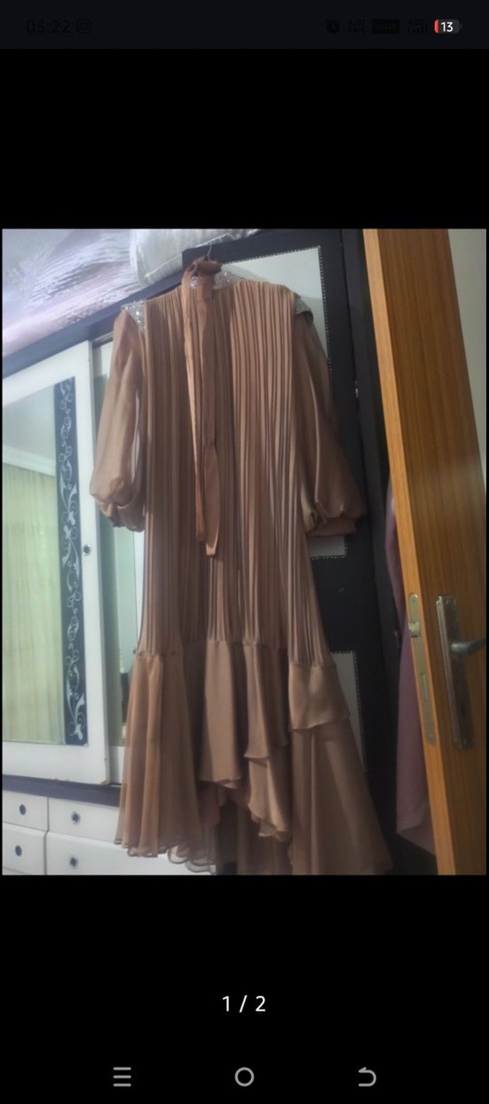 Bej renkli, piliseli uzun elbise, yüksek yakalı ve askılı kolludur. Hafif sentetik kumaştan yapılmış, bol kesimdir ve düğünler için uygundur.