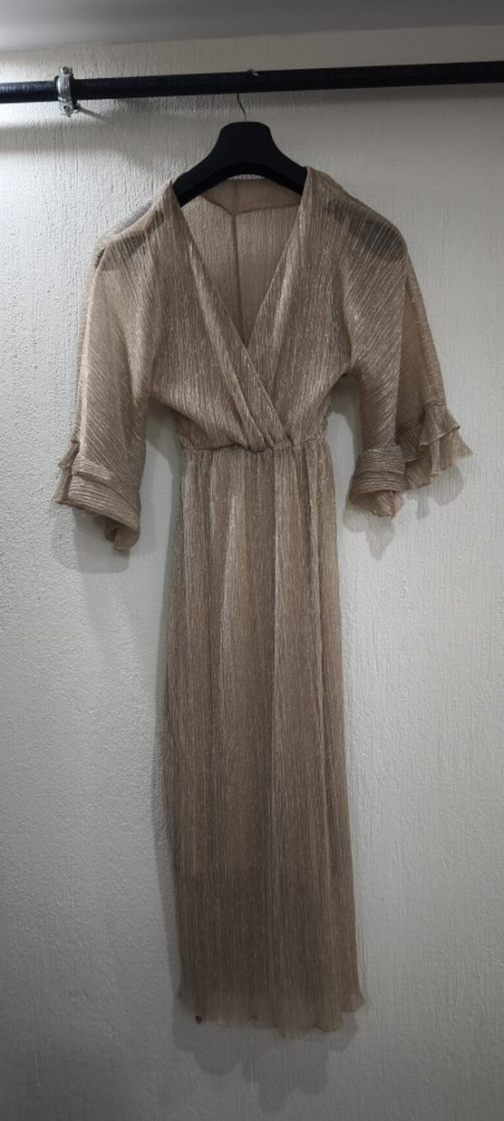 Bej renkte simli , piliseli, bol kesim ve V yakalı uzun elbise. Askılı kollu, bohem tarzda, esnek kumaştan, düğün için uygun.
