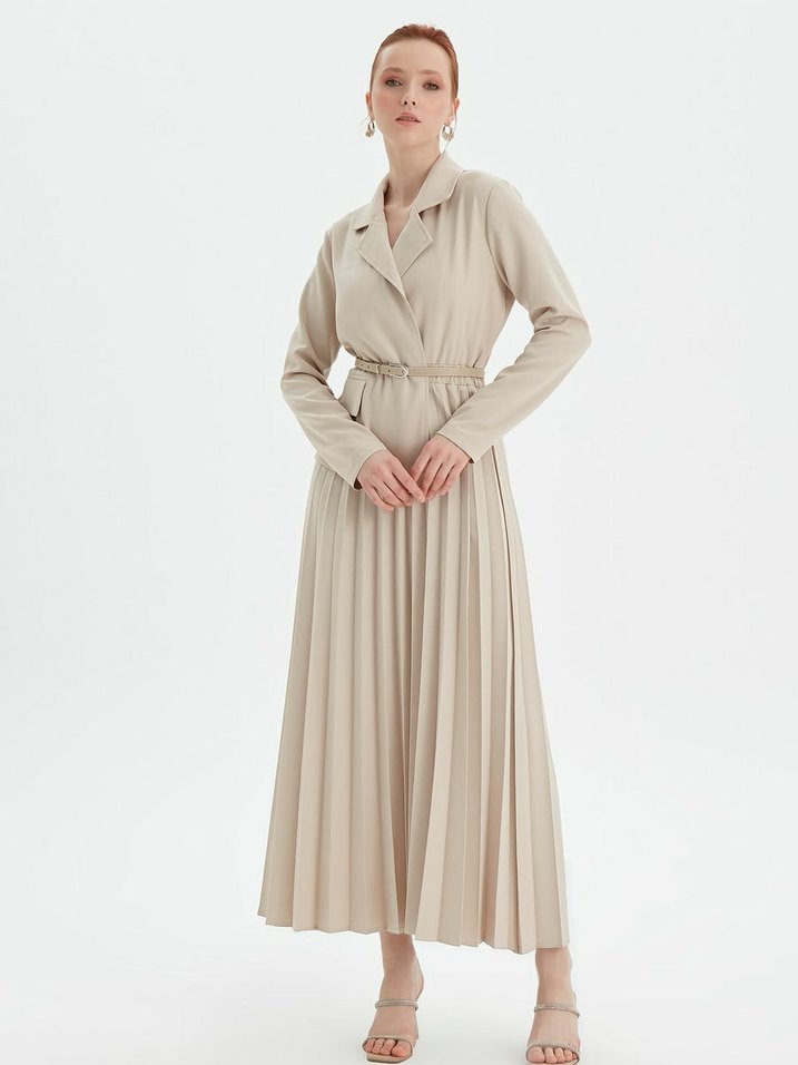 Birgül Bektaş markalı Bej renkli, piliseli uzun etekli ve notched lapel yakalı kadın elbise. Sadece iki kez giyildi. Sentetik kumaştan, uzun kollu ve modern klasik tarzda, ofis, resmi toplantılar da giyilebilir. 38 bedenle uyumludur.