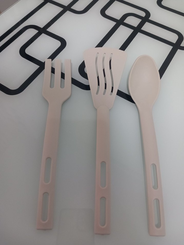 Saplarında asma delikleri bulunan bej plastik mutfak gereçleri seti. Çatal, spatula ve kaşık içerir.