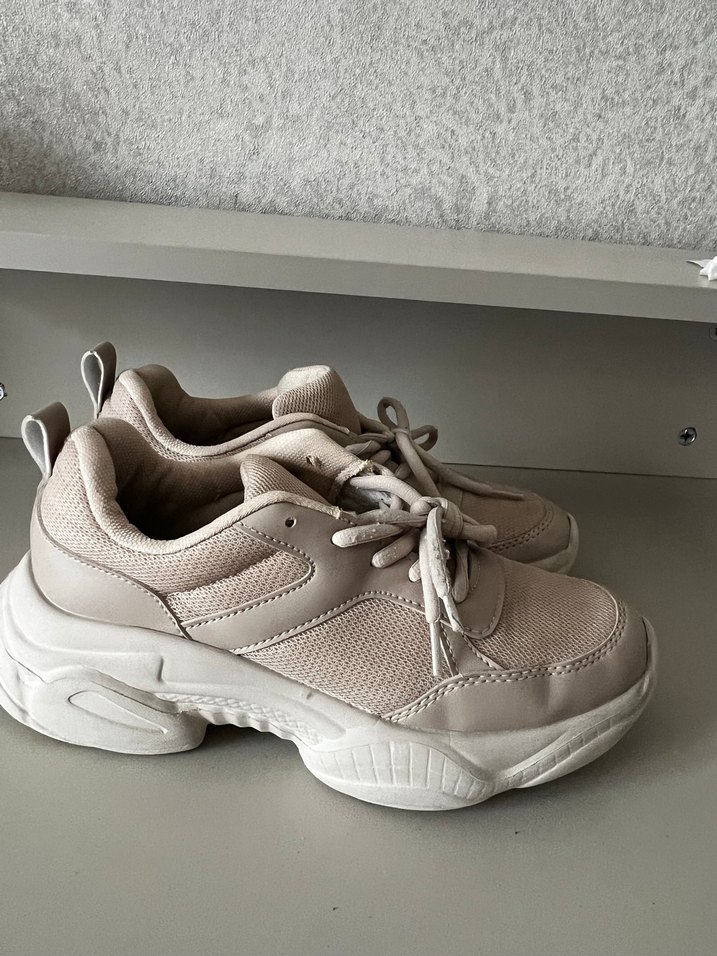 Bej renkli, platform tabanlı ve kauçuk tabanlı kadın spor ayakkabısı. Sokak stili ve spor görünüme uygun, zahmetsiz şıklık sunar.