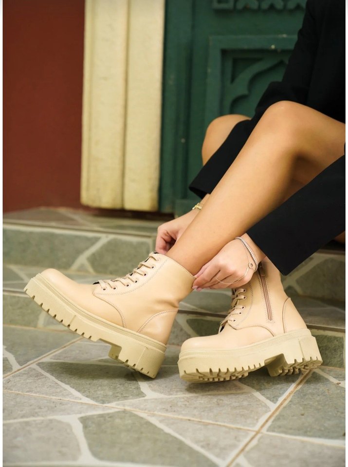Bej renkte, bağcıklı ve platform topuklu kadın botu. Kauçuk malzemeden üretilmiş, sokak tarzına uygun, günlük kullanıma ideal.