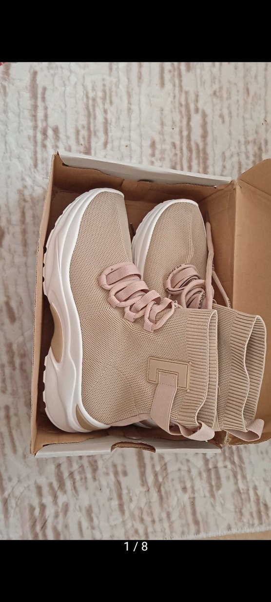 Bej renkte, platform topuklu ve bağcıklı kadın spor ayakkabısı. Yumuşak, nefes alabilen kumaştan ve kauçuk tabandan üretilmiştir. Günlük sokak stiline uygun. 2 defa giyildi yeni