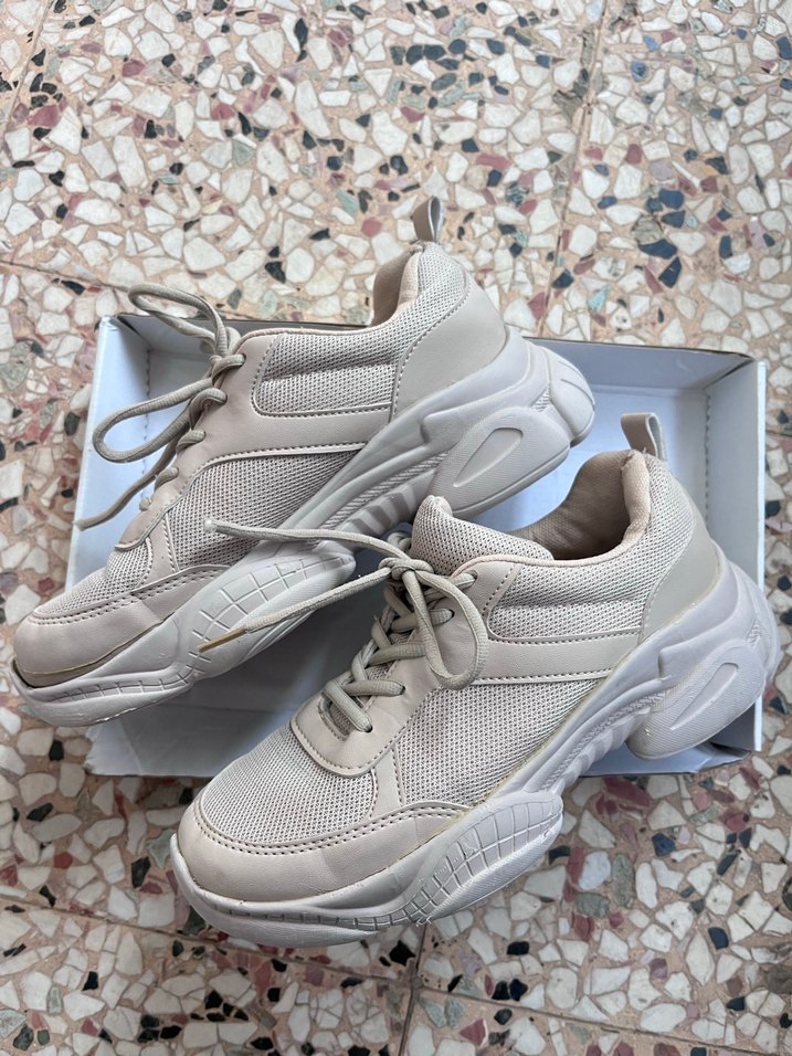 Bej renkli, bağcıklı ve platform topuklu spor ayakkabı, kauçuk tabanlı ve hafif yılan derisi desenli, spor ve günlük kullanıma uygun.