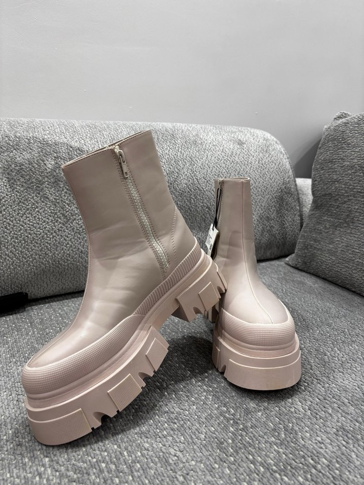 Bej renkte, platform topuklu ve fermuarlı kadın botu. Kauçuk malzemeden üretilmiş, sokak stili ve günlük kullanım için uygun.
