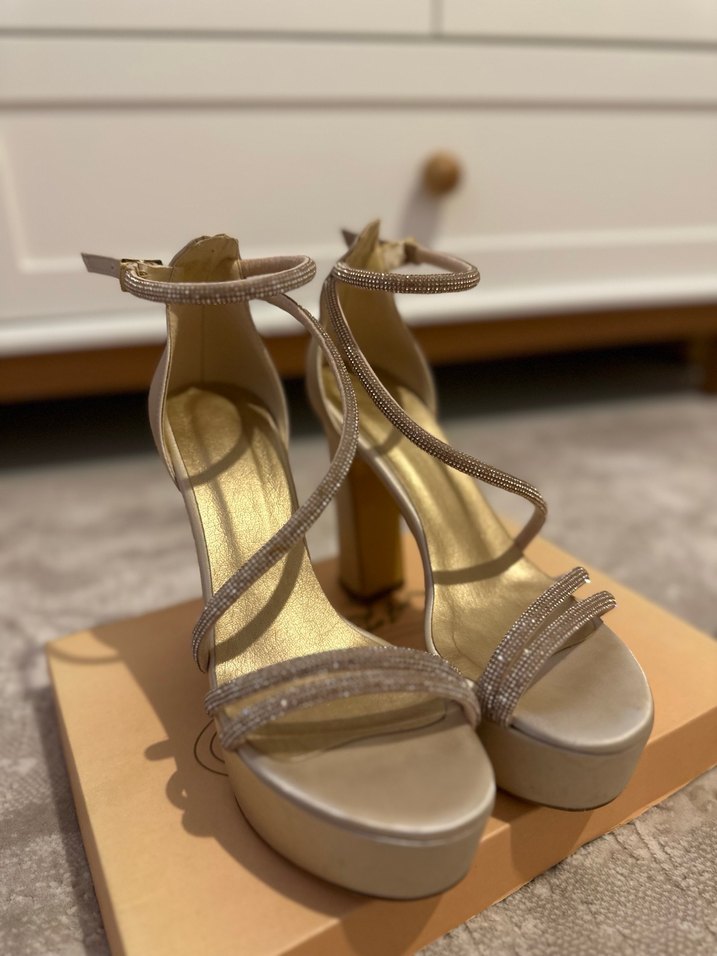 Bej renkte, satenimsi dokulu ve parlak platform topuklu, tokalı bantlara sahip çağdaş ve zarif kadın abiye ayakkabısı, düğün için uygun.