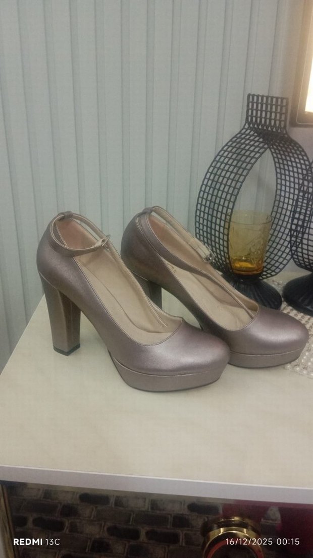 Bej platform topuklu, tokalı ve kauçuk malzemeden üretilmiş kadın ayakkabısı. Modern klasik tarzıyla ofis için uygun, desensiz şık tasarım.
