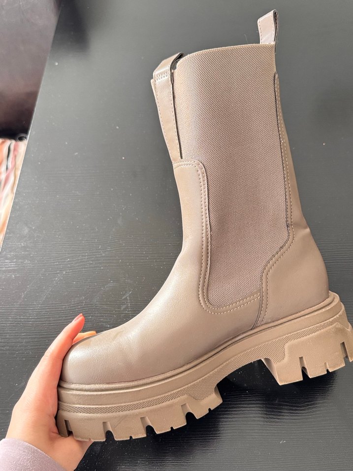Bej renkli, parlak platform topuklu kadın ayakkabı. Kauçuk taban ve cırt cırtlı kapanışa sahiptir. Günlük ve sokak stili için uygundur.