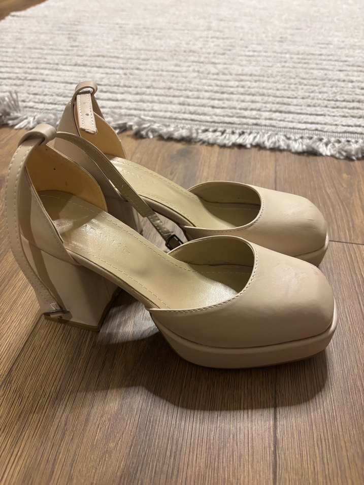 Bej platform topuklu, tokalı kayışlı. Ben kınam için abiyemi kaldırsın diye almıştım. Giydiğim en rahat platform topuklu ayakkabı. Bütün gece zıplamalı oynadım hiç vurmadı. Önünde birkaç çizik var, ben nazikçe silmeye çalıştım fakat çıkmadı. Rengi atmasın diye çok kimyasal kullanmadım.