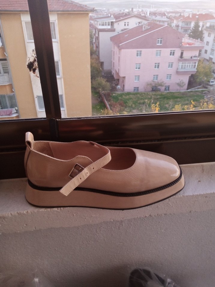 Bej renkte, tokalı bantlı platform topuklu kadın babet. Kauçuk malzemeden yapılmış, minimal ve günlük kullanıma uygun şık tasarım.38 yada 38,50 numaralar için uygun içi dışı komple deridir bir kez kullanıldı