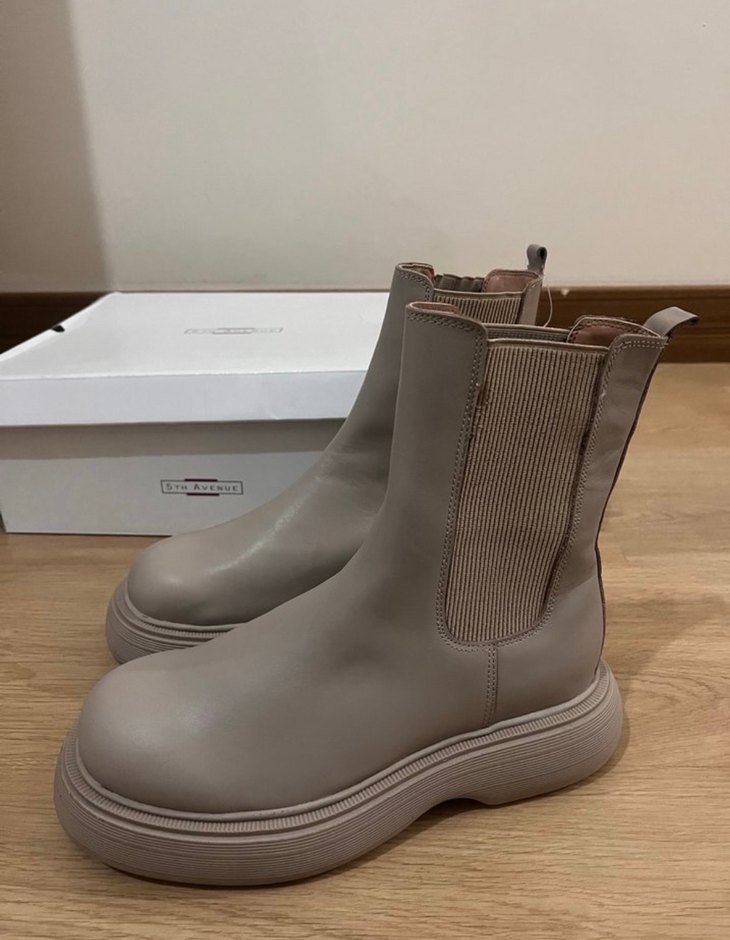 Bej renkte, kauçuk malzemeden platform topuklu kadın botlarıdır. Düz ve desensiz yapısıyla gündelik kullanıma uygundur, rahat ve şık bir tarz sunar.