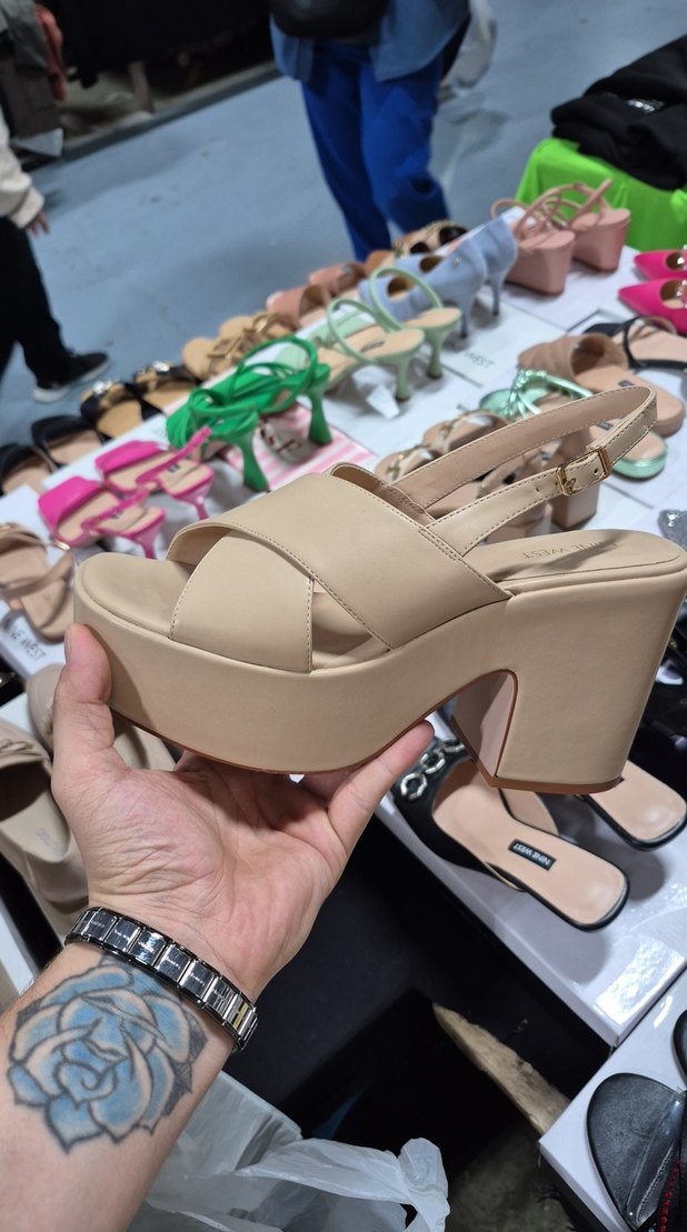 Bej renkte, tokalı bantlı, kauçuk malzemeden platform topuklu kadın sandalet. Günlük kullanıma uygun, sokak modasına uygun tarzda.