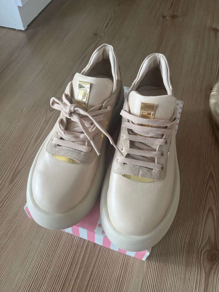 Bej renkte, platform topuklu, kauçuk malzemeden kadın spor ayakkabısı. Pastel tonlarda ve desensiz, zahmetsiz şıklık sunar. Hiç giyilmedi altını görüyorsunuz Yumuşacık deri