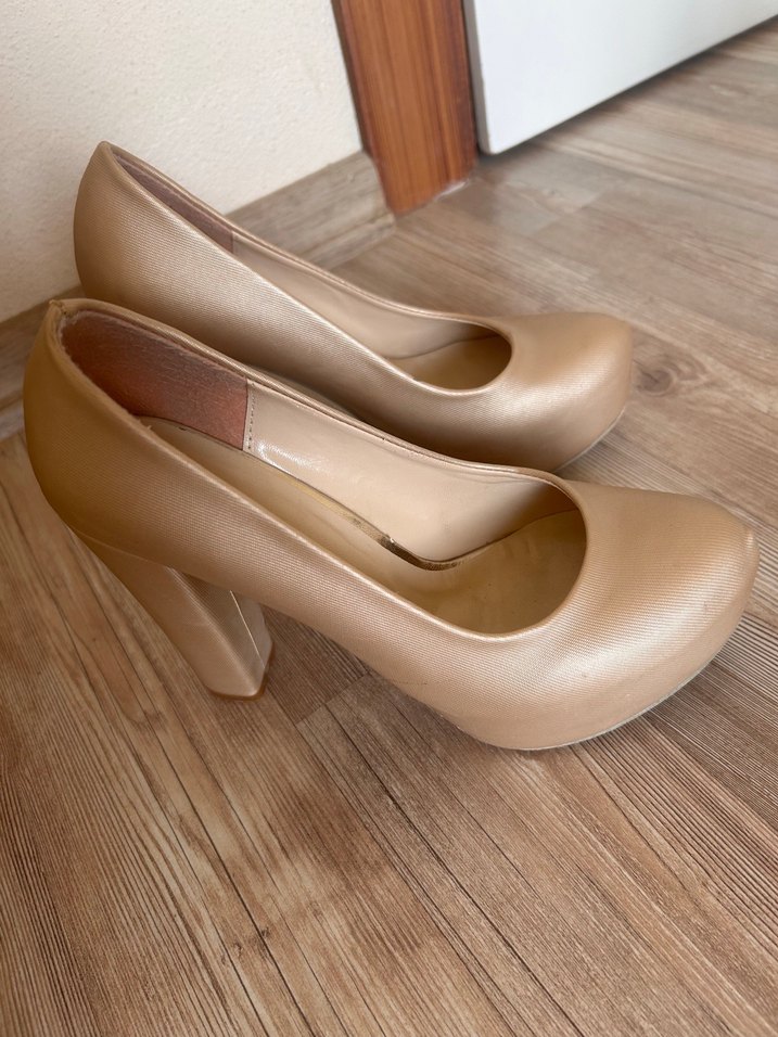 Bej platform topuklu, desen içermeyen kadın stiletto. Kauçuk malzemeden üretilmiş, ofis için modern klasik tarzda şık bir seçim.