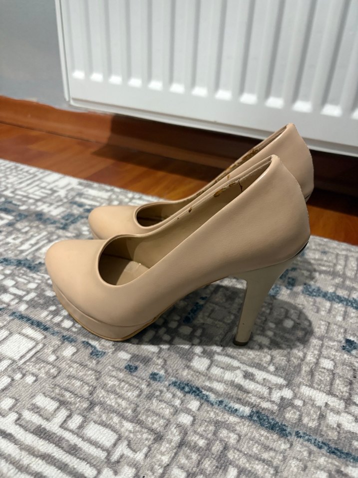 Bej platform topuklu stiletto, modern klasik tasarıma sahip ve kauçuk malzemeden üretilmiştir. En fazla üç defa giyilmiştir dolapta beklerken kenarında belli olmayan lekeler oluşmuş fotoğraflara ekledim. 8 cm topuk boyu Sahibine şimdiden hayırlı olsun