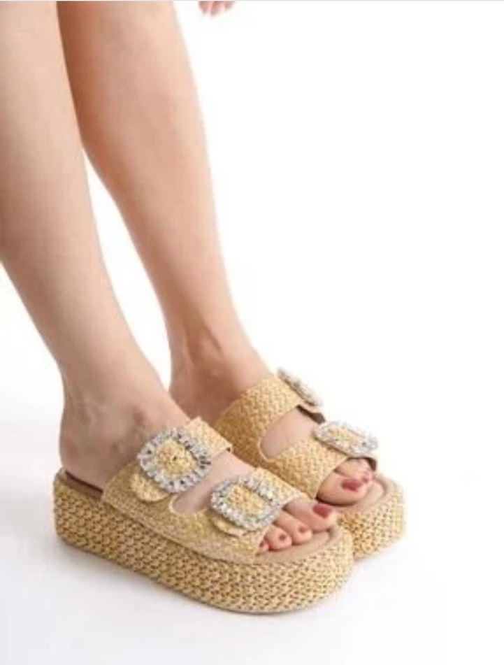 Bej renkli, tokalı kayışlara ve hasır desenine sahip, kauçuk malzemeden platform topuklu kadın terlikleri. Günlük kullanıma uygun, şık ve rahat. Sadece bir kez giyildi 720 tl ye almıştım
