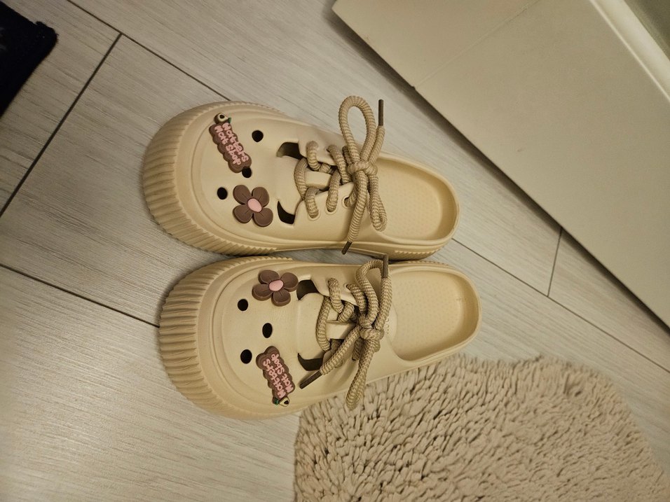 Bej platform topuklu kadın terlikler, baskılı detaylar ve bağcıklı tokalı tasarıma sahip, rahat ve sokak stili için uygun kauçuk malzemeden üretilmiştir.