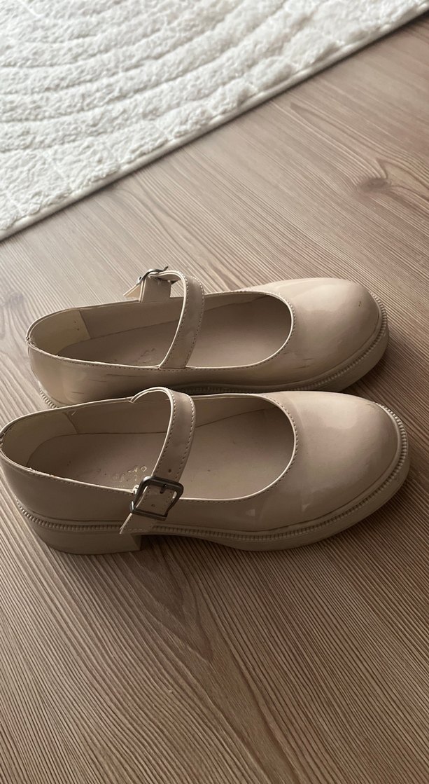 Bej renkte, tokalı bantlı, platform topuklu kadın babetleri. Düz ve desen içermeyen bu minimalist ayakkabılar günlük kullanıma uygundur.
