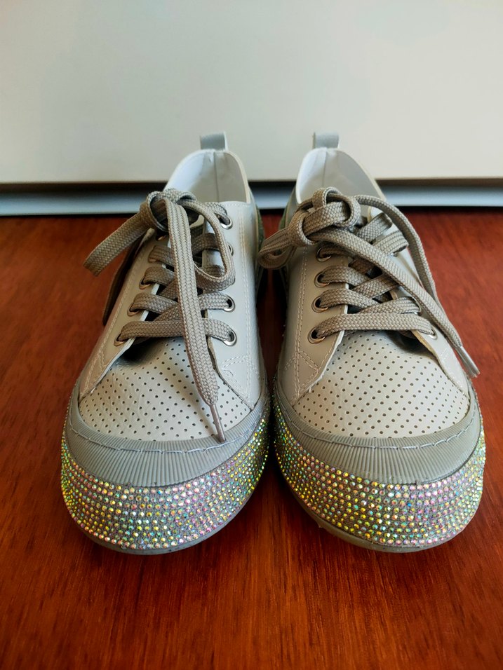 marka temsilidir iyi bir mağzadan alındı Almina ayakkabıdan delikli üst yüzeyi ve tabanda parıldayan taş detaylarıyla bej platform spor ayakkabı. Spor ve günlük kullanım için dayanıklı kauçuk malzeme kullanılmıştır. en arkasındaki taşlarda bir iki taş düşmüş ama çok belli değil