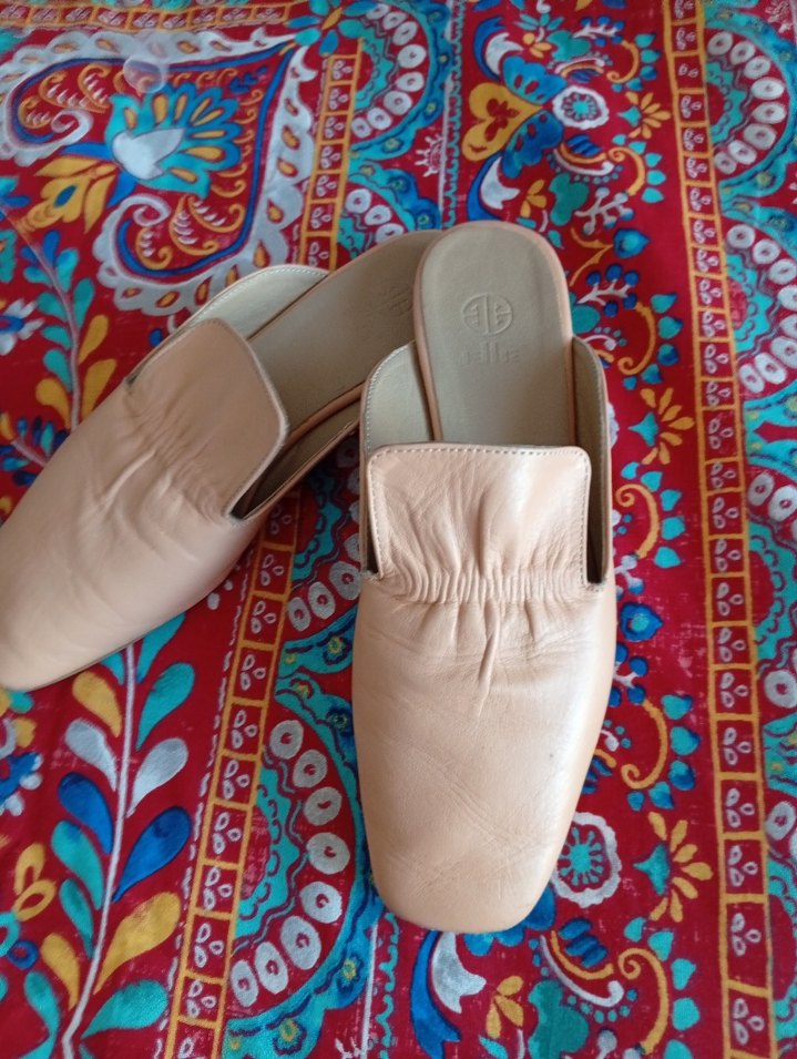 Bej renkli, blok topuklu kadın terlikler, pliseli detaylara sahiptir. Bohem tarzı ve pastel tonları günlük kullanıma uygundur.