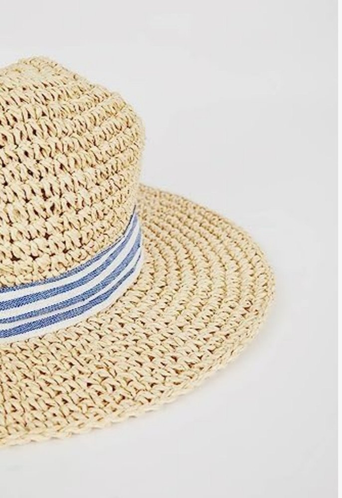Bej renkte, sentetik kumaştan pliseli tasarıma sahip kadın şapkası. Açık mavi çizgili bant ile bohem, retro ve hippie tarzını yansıtıyor.