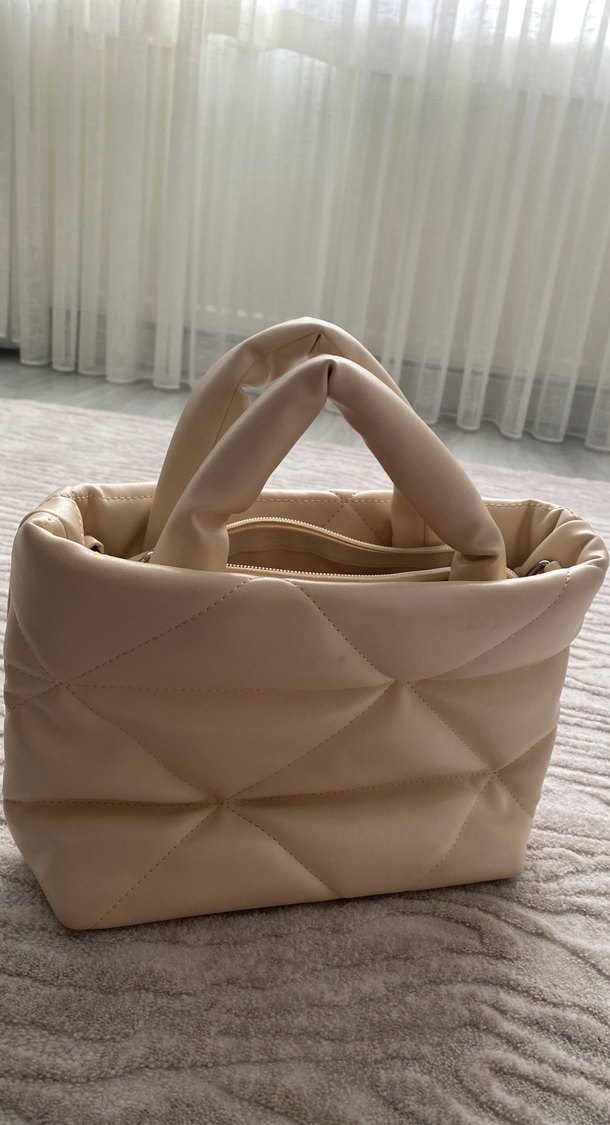 Bej renkli, pliseli tasarıma sahip kadın çantası, yumuşak sentetik kumaştan yapılmıştır ve günlük kullanıma uygundur.