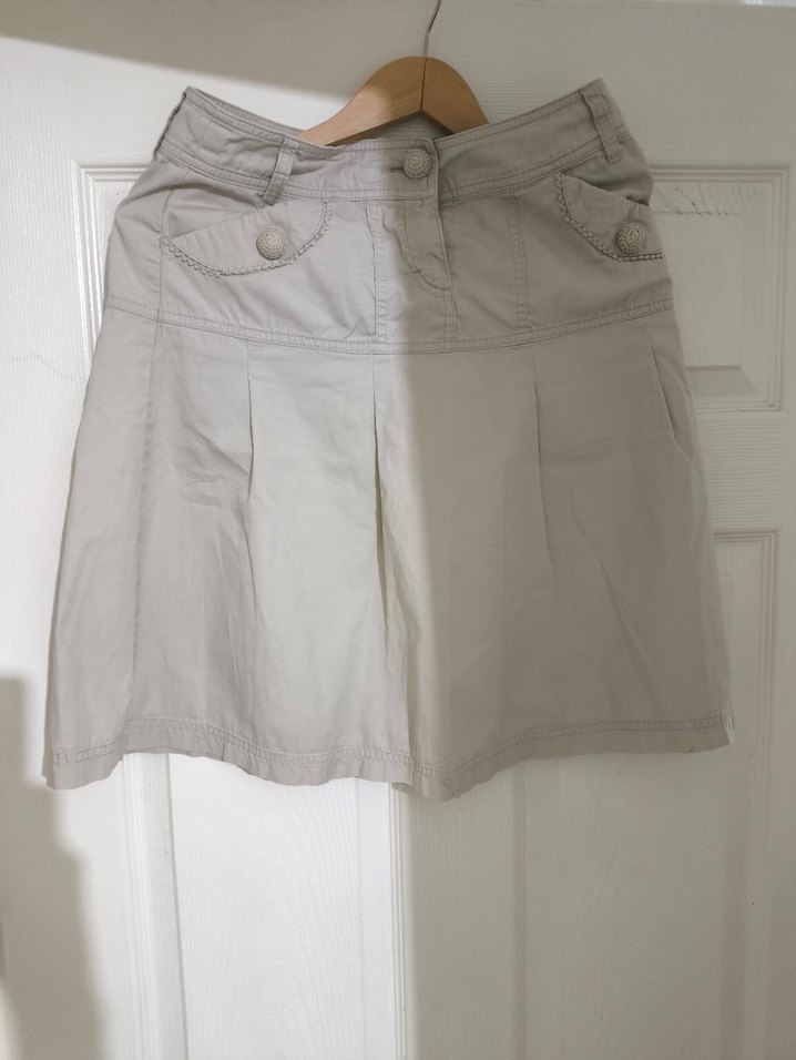 Nefes alabilen keten kumaştan, bol kesim bej midi etek, pliseli detaylarla günlük kullanıma uygundur.