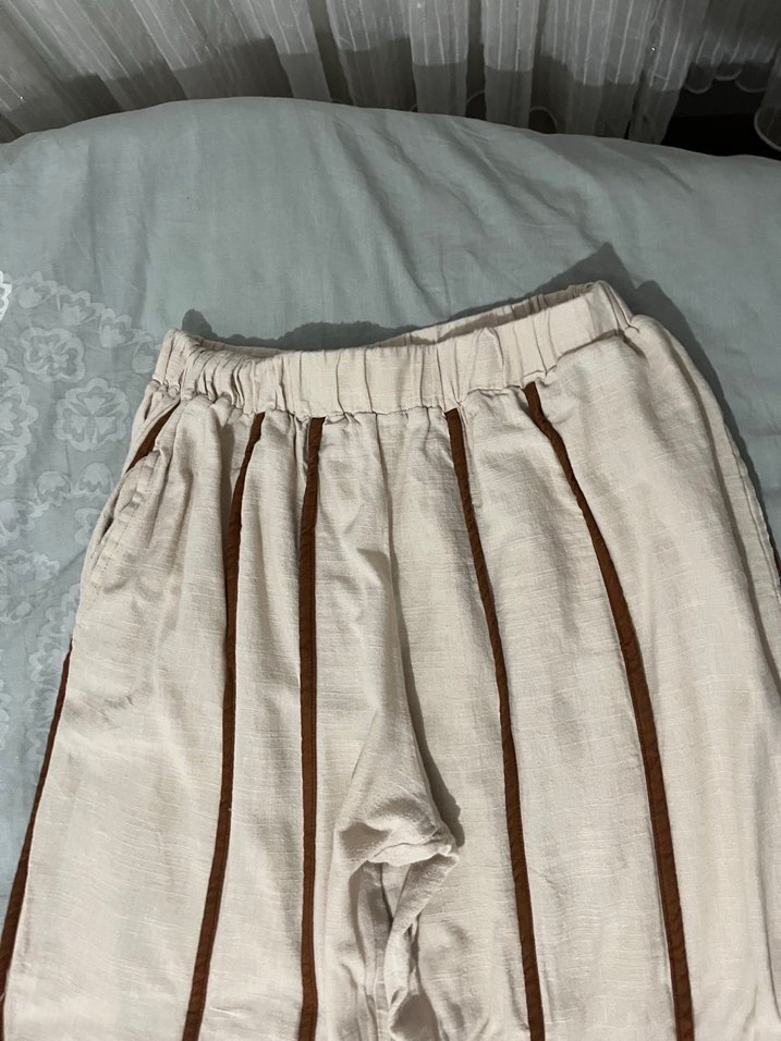 Bej renkli keten kumaştan, pliseli ve lastikli bel detaylı, midi boyda bol kesim kadın pantolon. Ürün M/L uyumludur