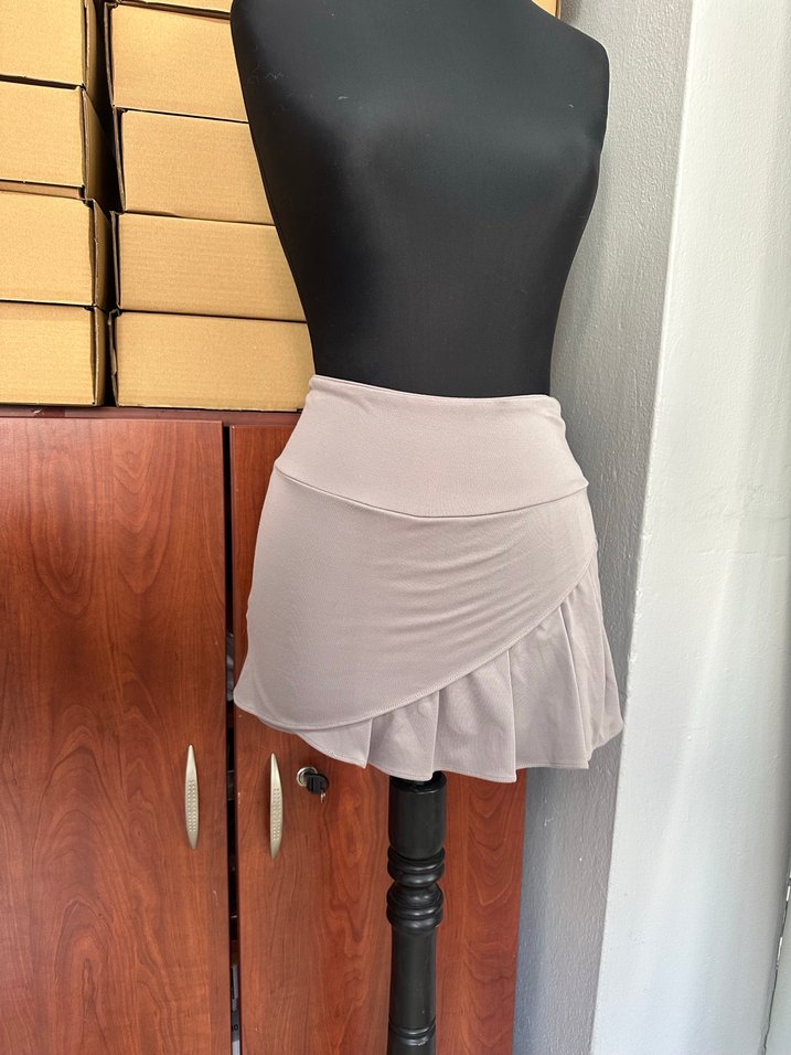 Yumuşak sentetik kumaştan yapılmış, pliseli detaylara sahip bej renkli, vücuda oturan kısa mini etek.