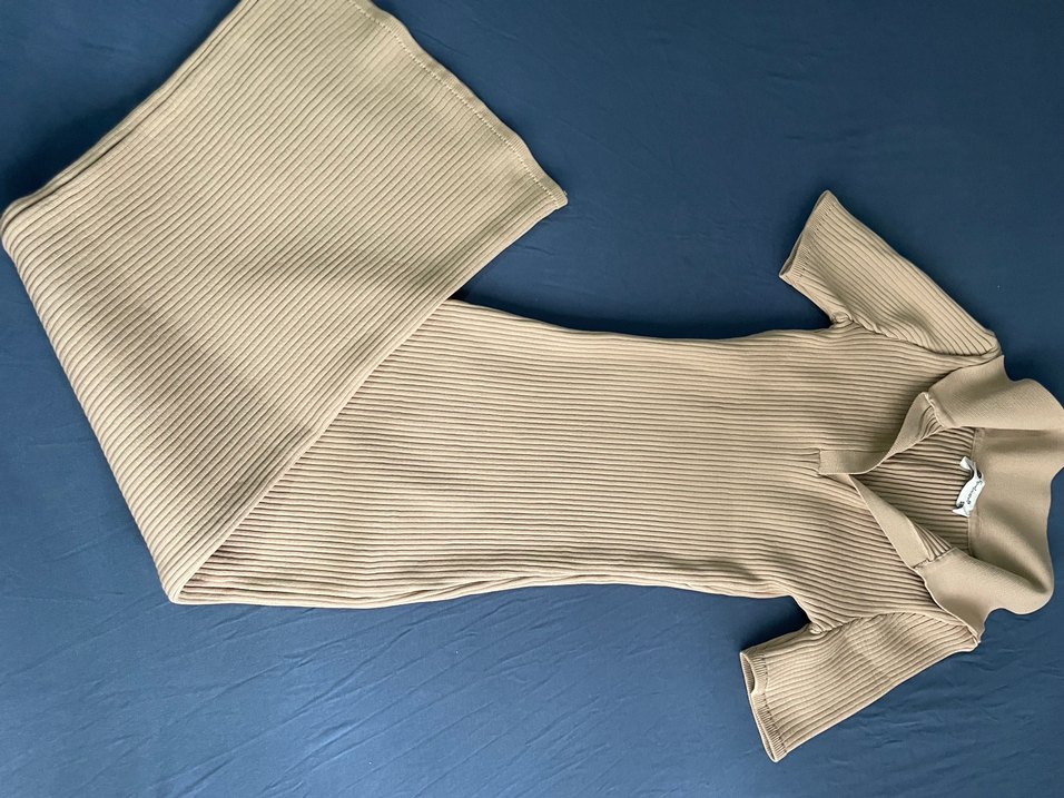 Esnek kumaşı var vücuda yapışıyor bej renkli elbise
