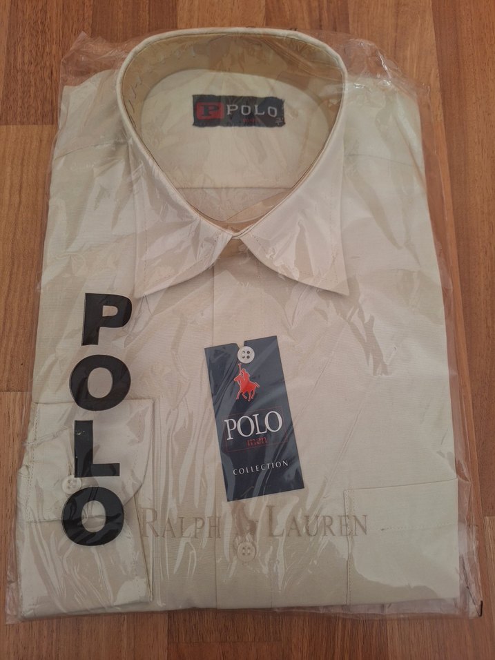 Bej renkli Polo marka erkek gömlek. Sentetik kumaştan, regular fit ve kemerli, ofis için uygun tarzda. L bedendir.