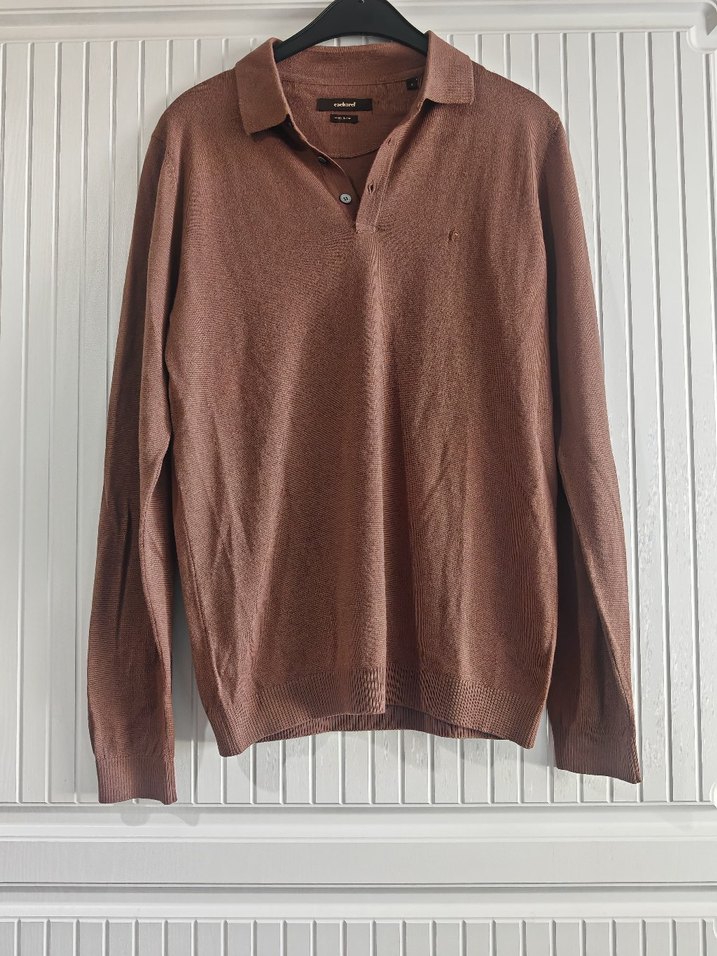 Bej renkli, polo yaka ve uzun kollu erkek keten kazak. Düğmeli ve bol kesim, sade tasarımıyla günlük sokak stili için uygundur.