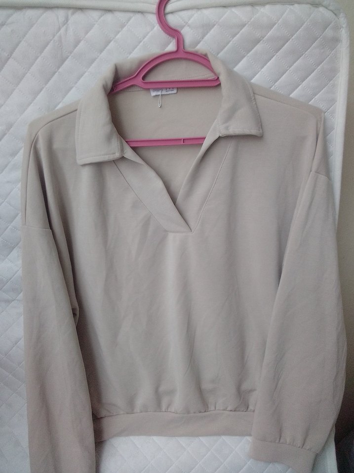 kullanilmamisdir... iki kol alti 52 boy 55 Bej renkli, polo yaka ve uzun kollu kadın sweatshirt. Rahat kesim ve normal uzunlukta, yumuşak sentetik kumaştan üretilmiştir. Günlük sokak stiline uygundur.