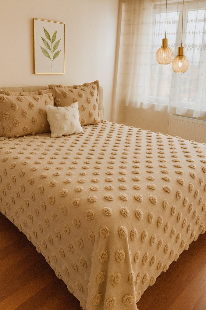 Bej ponpon Pike Yatak Örtüsü 260×260