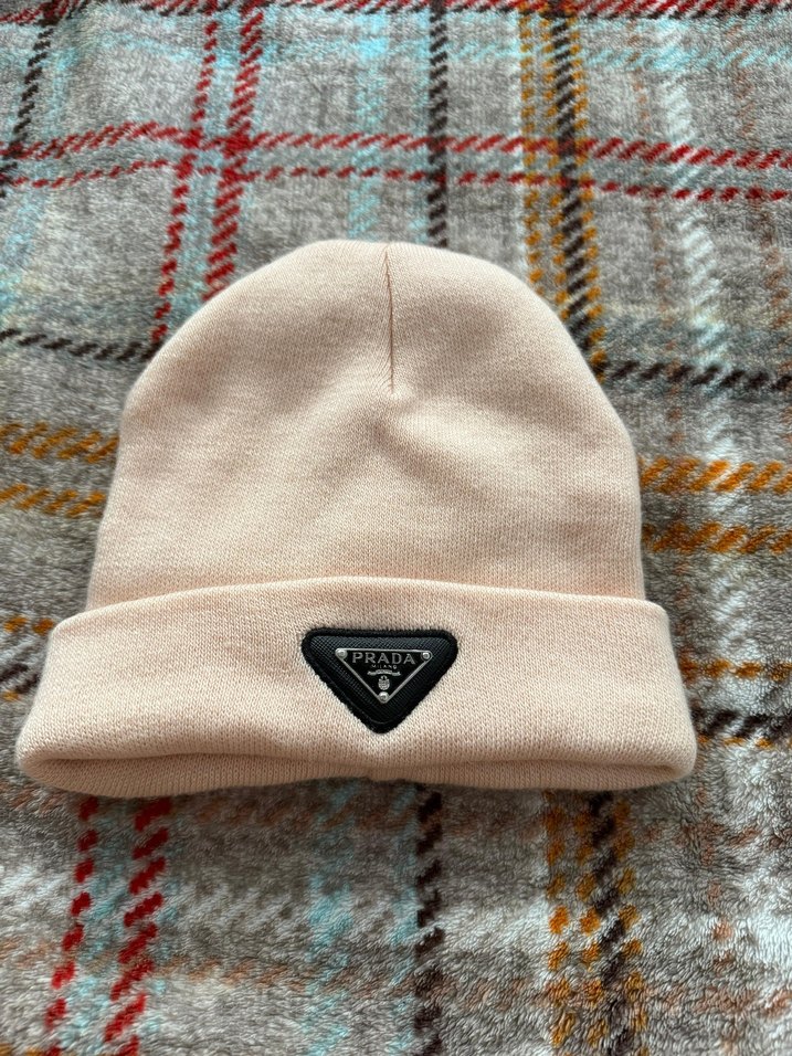Yumuşak örgü kumaştan yapılmış bej renkli bu bere, Prada logo detayıyla trend sokak stiline uygundur.