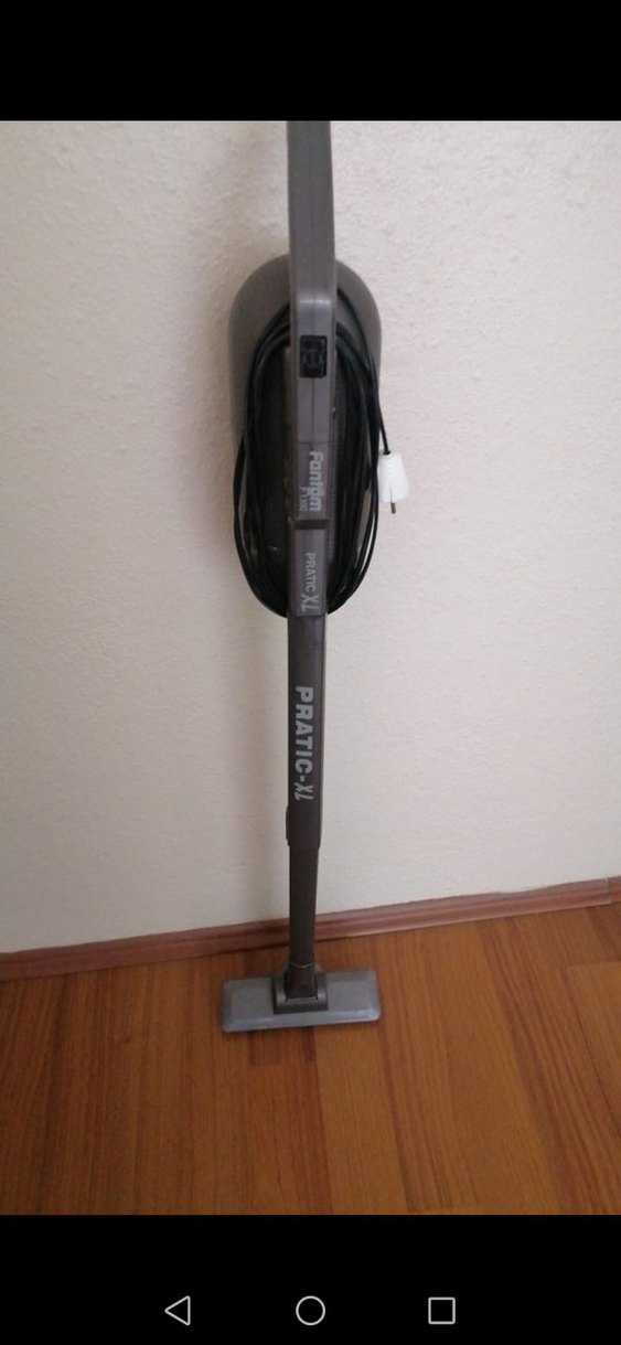Bej renkli Pratic-A dikey elektrikli süpürge, koyu renk sapı ve ince tasarımıyla kolay saklama sağlar. Uzun kablosu sayesinde geniş alanlarda kullanılabilir.