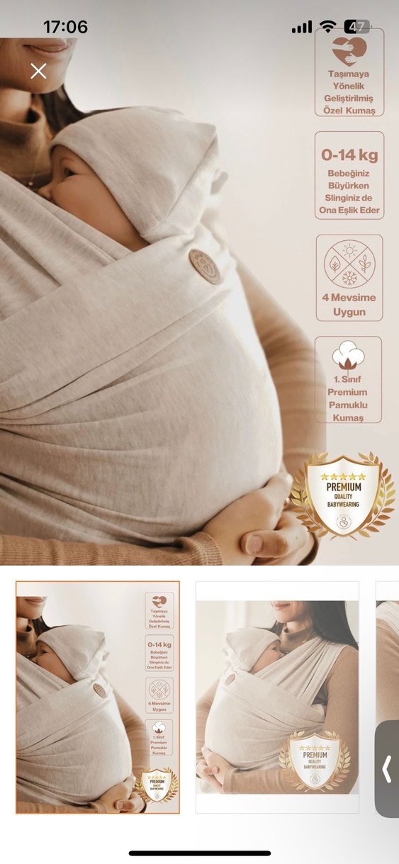 Bej renkli, 0-14 kg bebekler için uygun, 4 mevsim kullanılabilen premium pamuklu kumaştan yapılmış bebek slingidir.
