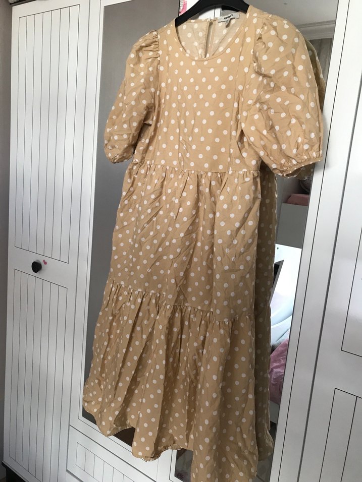 Bej renkli, pamuklu kumaştan yapılmış bu hamile elbisesi, bol kesim ve fırfır detaylara sahip. Puantiyeli deseni, kabarık kolları ve yuvarlak yakası vardır.
