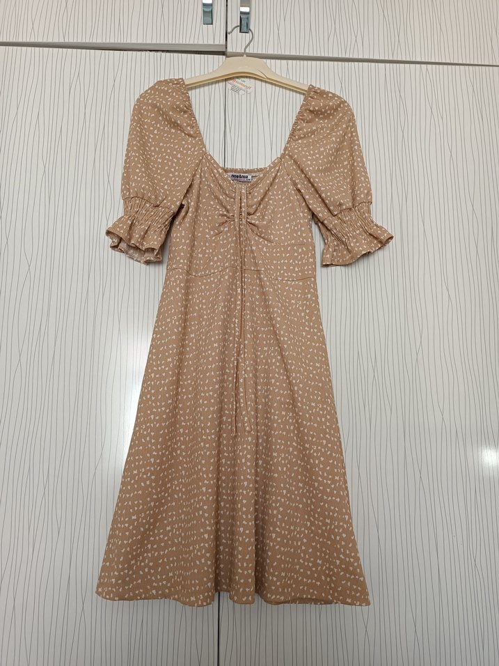 Bej renkte, keten kumaştan uzun elbise. V yaka ve kısa pileli kollara sahip, bol kesim ve vintage puantiyeli desenli. Rahat ve bohem tarzda.