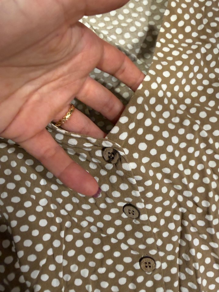 Bej renkli pamuklu kumaştan, beyaz puantiyeli, düğmeli, V yakalı, kısa kollu, normal boyda, bohem Paris tarzı