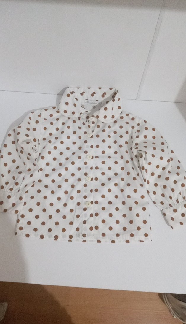 Bej renkli, uzun kollu kız çocuk gömleği. Pamuk kumaştan, düğmeli ve yakalıdır. Puantiyeli deseni ve rahat kesimiyle sokak stiline uygundur.