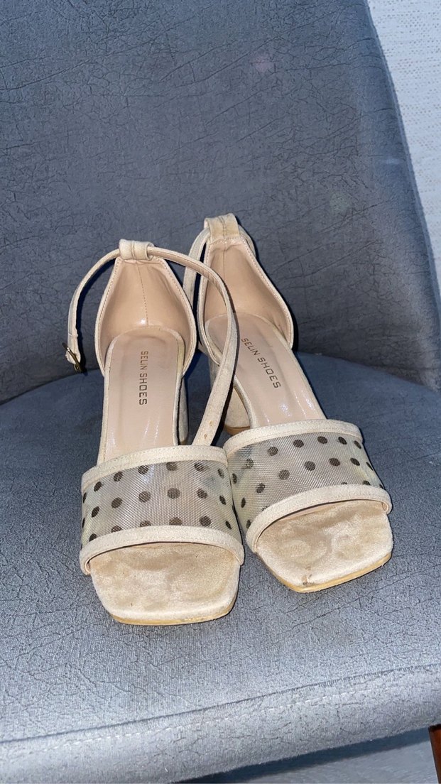 Bej Puantiyeli Kadın Topuklu Sandalet