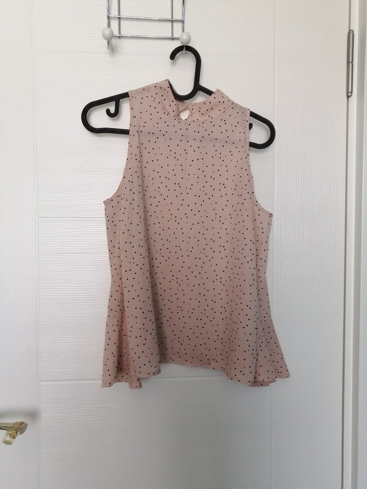 Kolsuz, yüksek yakalı, bej renkli küçük puantiyeli bluz. Arkada düğmeli ve rahat bir kesime sahip, günlük kullanıma uygun.