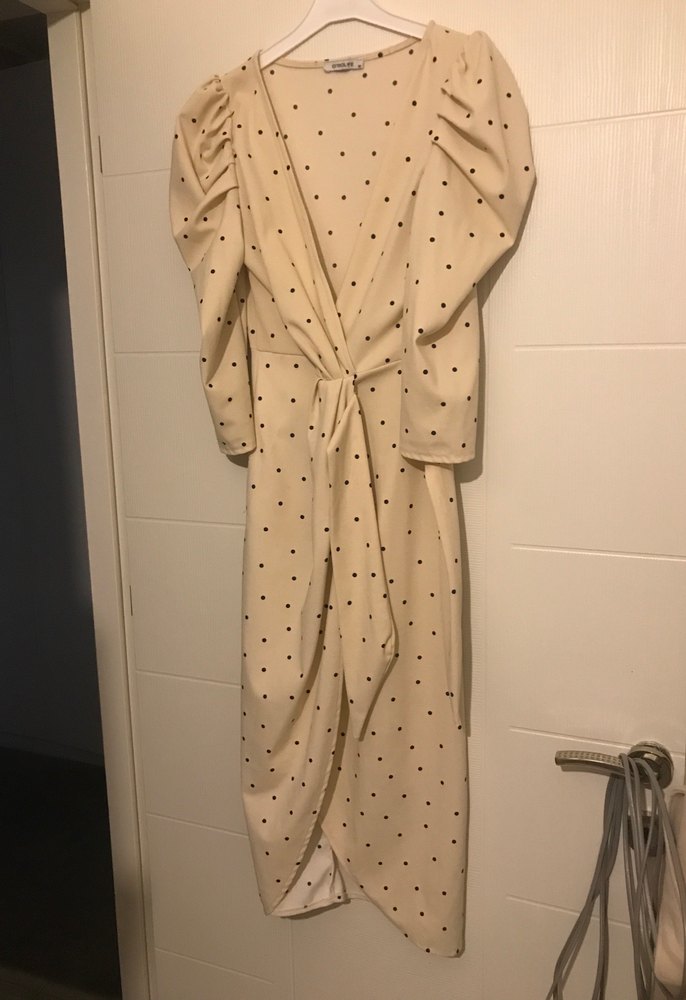 Bej renkte, puantiyeli uzun elbise, drapeli ve v yaka detaylıdır. İnce askılı ve vücuda oturan kesimiyle romantik akşamlar için uygundur.