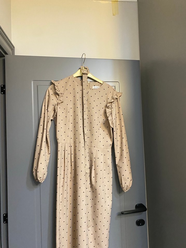 Bej puantiyeli uzun keten elbise, uzun kollu, fırfırlı ve V yakalı. Regular fit, sokak modasına uygun.